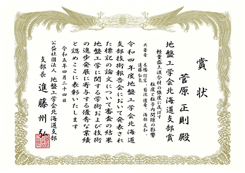 このたび、当社社員(地質部 菅原正則)が令和5年4月24日に開催された地盤工学会北海道支部総会において「地盤工学会北海道支部賞」を受賞しました。