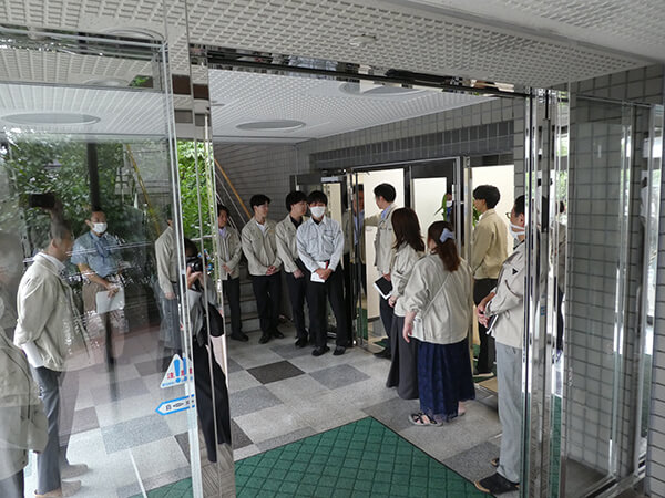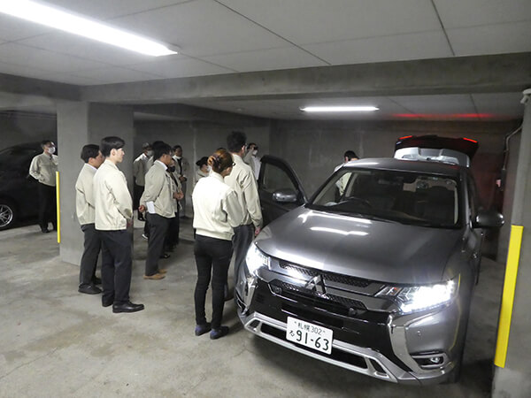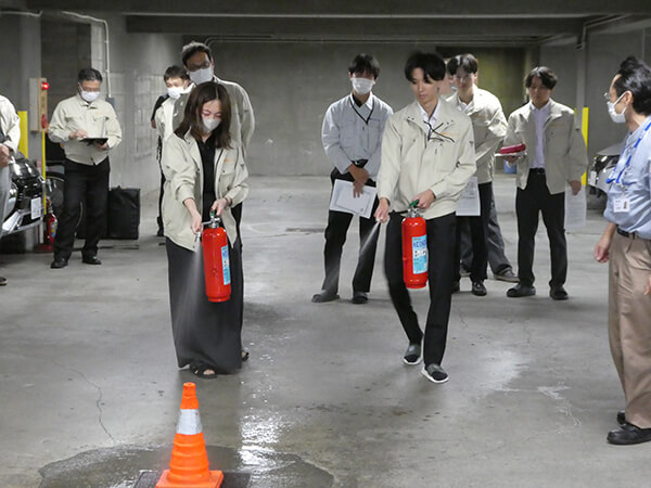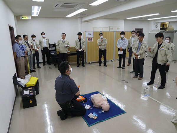 地震による災害を想定し、当日朝に役職員への安否確認メールの送受信確認、本社屋内備蓄品(飲料水・簡易トイレ等)の確認、停電時の玄関及びシャッターの開閉方法確認、PHEV車からの電力供給方法の確認、AEDや消火器設置場所の確認に加え、AEDの操作手順講習や消火器の使い方を学びました。