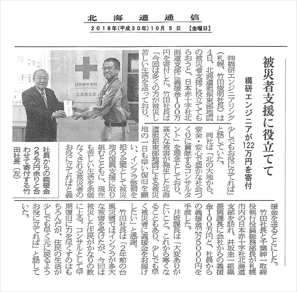 弊社は、この度の北海道胆振東部地震において被災された方々の支援に役立ててもらうため、日本赤十字社北海道支部を通じて1,225,000円(会社からの寄付1,000,000円、および役職員による寄付225,000円)を寄付いたしました。