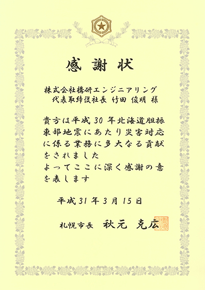 平成30年9月に発生した北海道胆振東部地震の災害対応に関わる業務に貢献したことに対して、札幌市長より感謝状を受領いたしました。